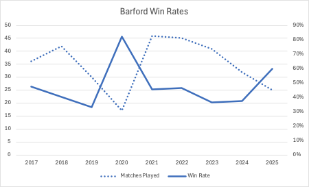 Winning is not the reason Barford play cricket, although it is nice to be on the right side of the scorebook occasionally. The following chart shows the rollercoaster ride that Barford offers – over the last nine years we’ve won just under half of our 300 plus games. That seems pretty good given the age and condition of most of our players!
